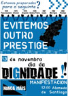 Pero esa concordancia con algúns dos obxectivos de nacionalistas e socialistas, entre eles sacar a Fraga da Xunta, non quere dicir que desde Nunca Máis non sigan a reclamar “solucións é xustiza”. Ese é, precisamente, o lema da manifestación. Reclaman “coa mesma forza ca sempre, coa mesma coherencia e coa mesma firmeza, un compromiso claro das Administracións para superar a catástrofe e as súas secuelas”. Desde Nunca Máis afirman que as consecuencias do Prestige non están superadas. Sinalan feitos que así o constantan: Aínda hai afloramentos de petróleo, a semana pasada na praia do Rostro; reducción importante nas capturas da pesca e marisqueo... e, sobre todo, a persistencia do mesmo risco nas costas galegas. Máis de 13.000 barcos pasan anualmente diante das costas galegas con mercadorías perigosas nas mesmas condicións que o Prestige. Así, o chamamento á cidadanía é claro para evitar outro Prestige e ás autoridades para que leven a cabo accións en tres liñas fundamentais: apoiar a recuperación económica dos sectores afectados; avanzar na rexeneración medioambiental e urxente tratamento e procesamento axeitados dos residuos procedentes do Prestige e, por último, reducir o risco de novos accidentes nas costas. Polo tanto, non se trata dunha efemérides máis, agora institucionalizada, senón dunha data reivindicativa que ten todos os alicerces para callar no calendario galego como referencia mobilizadora de persoas e conciencias.