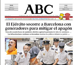 La beneiteria, el fet d'actuar com a babaus d'una part de les nostres institucions i d'una gran part dels mitjans de comunicació ha rebut avui una autèntica lliçó de sentit d'estat, que és el que tenen i exerceixen des de la metròpoli. El diari ABC titula: "El Ejército socorre a Barcelona con generadores para mitigar el apagón" i presenta subliminalment l'exèrcit espanyol com a salvador d'uns pobrets, els catalans, que s'han quedat sense llum.