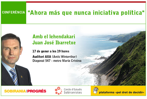 Després de rebre més d’una dotzena de peticions per venir a Catalunya a exposar la situació d’Euskadi i la seva proposta, el lehendakari Ibarretxe ha decidit fer-ho el proper 17 de gener. Oficialment el conviden Sobirania i Progrés, el Cercle d’Estudis Sobiranistes i la Plataforma pel dret de decidir, però hi ha hagut molts altres sectors que han fet possible aquesta vinguda, renunciant al seu propi protagonisme. El lehendakari farà diverses trobades amb partits polítics, grups socials i intel·lectuals, i possiblement serà entrevistat per TV3 o Catalunya Ràdio.