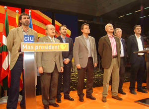 Amb eufòria continguda, prop de 4.000 militants i simpatitzants de CiU van assistir al míting central a Barcelona ahir diumenge. La federació va jugar fort, amb la presència de l'amagat expresident Jordi Pujol, i forçant l'assistència de Josu Jon Imaz, tot i les reticències d'una part de la direcció del PNB, i d'Anxo Quintana, líder del BNG. El representant del PNB va fer part del seu discurs en un català impecable. Durant el míting, el candidat de CiU, Artur Mas, va advertir als dirigents d'ERC que "cap nacionalista de pedra picada" dubtaria en escollir "un president nacionalista a Catalunya", i va denunciar que als republicans "els pesa més l'animadversió a CiU que un bon servei a Catalunya". Mas també va alertar que ERC portarà a Zapatero al "despatx del president de la Generalitat".
