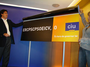La federació nacionalista va presentar dilluns la imatge de la precampanya electoral. Es tracta d’un disseny que accentua la sensació de desordre atribuïda al tripartit i que aposta clarament pel dilema: a un costat hi ha les sigles dels partits que conformaven inicialment el govern català (més la del PSOE) sobre un fons negre i a un altre costat, sobre un fons groc i net, el logo de CiU i el lema “és hora de governar bé”. Un altre model, molt similar, parla de tripartit i reprodueix un garbuix en lloc de les sigles al costat esquerre. Segons David Madí, un dels directors de campanya junt a Joana Ortega, aquesta propaganda “és de conceptes i no de candidat, perquè volem ser el punt de trobada de totes les sensibilitats catalanistes i sobiranistes”. I és que, pel dirigent nacionalista, que alerta de la possibilitat de reedició del tripartit, “CiU és l’únic valor segur”. El missatge no inclou cap referència al Partit Popular, amb qui CiU ha assegurat que no pensa fer cap pacte electoral. Madí va aprofitar la presentació de la imatge, que es veurà en tanques, premsa i internet fins el 15 d’octubre, per recordar al PSC el compromís adquirit el 13 de setembre de fer un cara a cara entre Artur Mas i José Montilla. Per Madí, “seria molt greu que Montilla incomplís la seva paraula ja abans de les eleccions negant-se a fer el cara a cara al que s’havia compromès”.