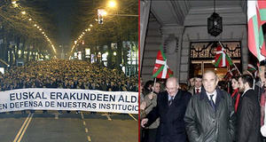 Desenes de milers de bascos de totes les edats i condicions socials es van manifestar per la Gran Via de Bilbo -quan se'ns diu que estem en una democràcia- per defensar les seves institucions. Era el crit d'alerta d'una societat que vol ser respectada i que envia un missatge clar i contundent a la metròpoli: "no ens deixarem trepitjar. Què s'han cregut aquesta gent?". L'acte va acabar amb una contundent declaració a favor del lehendakari i la institució que representa feta pels seus dos antecessors, Ardanza i Garaikoetxea. Pel seu interès, a la secció de documents hi enllacem la intervenció dels dos exlehendakaris.