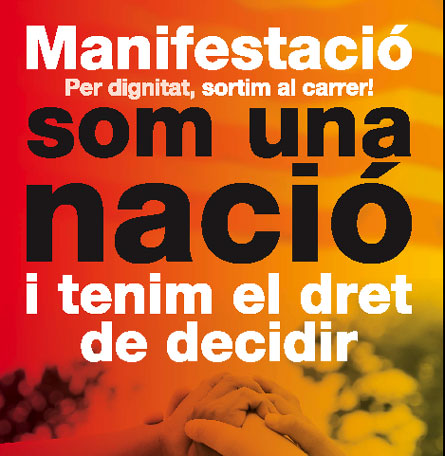 Sota el lema Som una nació i tenim el dret de decidir, els impulsors de la marxa, convocada pel proper 18 de febrer, consideren que el poble català, com qualsevol altre, té el dret de decidir el seu futur sense interferències d'altres nacions. Avui han presentat a Barcelona el cartell i el recorregut de la manifestació, que començarà a les Sota el lema Som una nació i tenim el dret de decidir, els impulsors de la marxa, convocada pel proper 18 de febrer, consideren que el poble català, com qualsevol altre, té el dret de decidir el seu futur sense interferències d'altres nacions. Avui han presentat a Barcelona el cartell i el recorregut de la manifestació, que començarà a les 17h des de la Plaça d’Espanya i arribarà a la Plaça de Catalunya. De moment, només un partit polític, ERC, dóna suport a la manifestació, mentre que la resta de formacions, que ja han subscrit l’acord Mas-Zapatero, no hi assistiran. Pel que fa a altres entitats culturals del país, com per exemple l’Òmnium Cultural o l’Ateneu Barcelonès, el Centre Excursionista de Catalunya, etc, aquests dies s’estan reunint per prendre una decisió sobre si s’adhereixen o no a la convocatòria. L'organització posa a disposició de tothom autocars gratuïts per assistir a la manifestació. Per apuntar-s'hi, cal trucar al 902 789 905.